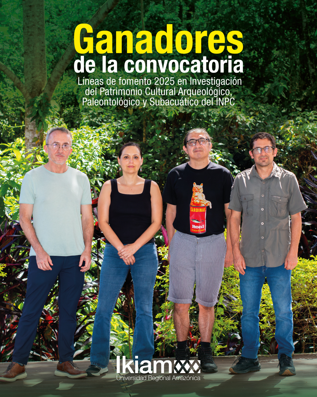 Los docentes investigadores de Ikiam Pablo Meneses, Noemí López, Jorge Celi y Sebastián Araujo fueron seleccionados como ganadores de la convocatoria Líneas de Fomento 2025 del Instituto Nacional de Patrimonio Cultural (INPC), en el área de Investigación del Patrimonio Cultural Arqueológico, Paleontológico y Subacuático.